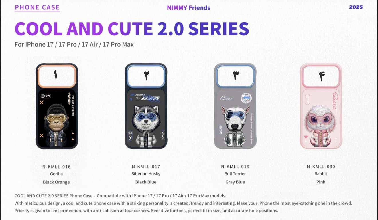 قاب Nimmy cool & cute با ساختار خوشدست و وزن سبک خود باعث میشود استفاده روزمره از گوشی ساده و بدون دردسر باشد. این قاب حتی میتواند طوری طراحی شود که با مدلهای مختلف آیفون مثل آیفون ۱۷ پرو و ۱۷ پرو مکس سازگار باشد و بهصورت کاملاً فیت روی گوشی قرار گیرد؛ بدون ایجاد لغزش یا مانع در عملکرد دکمهها و پورتها.