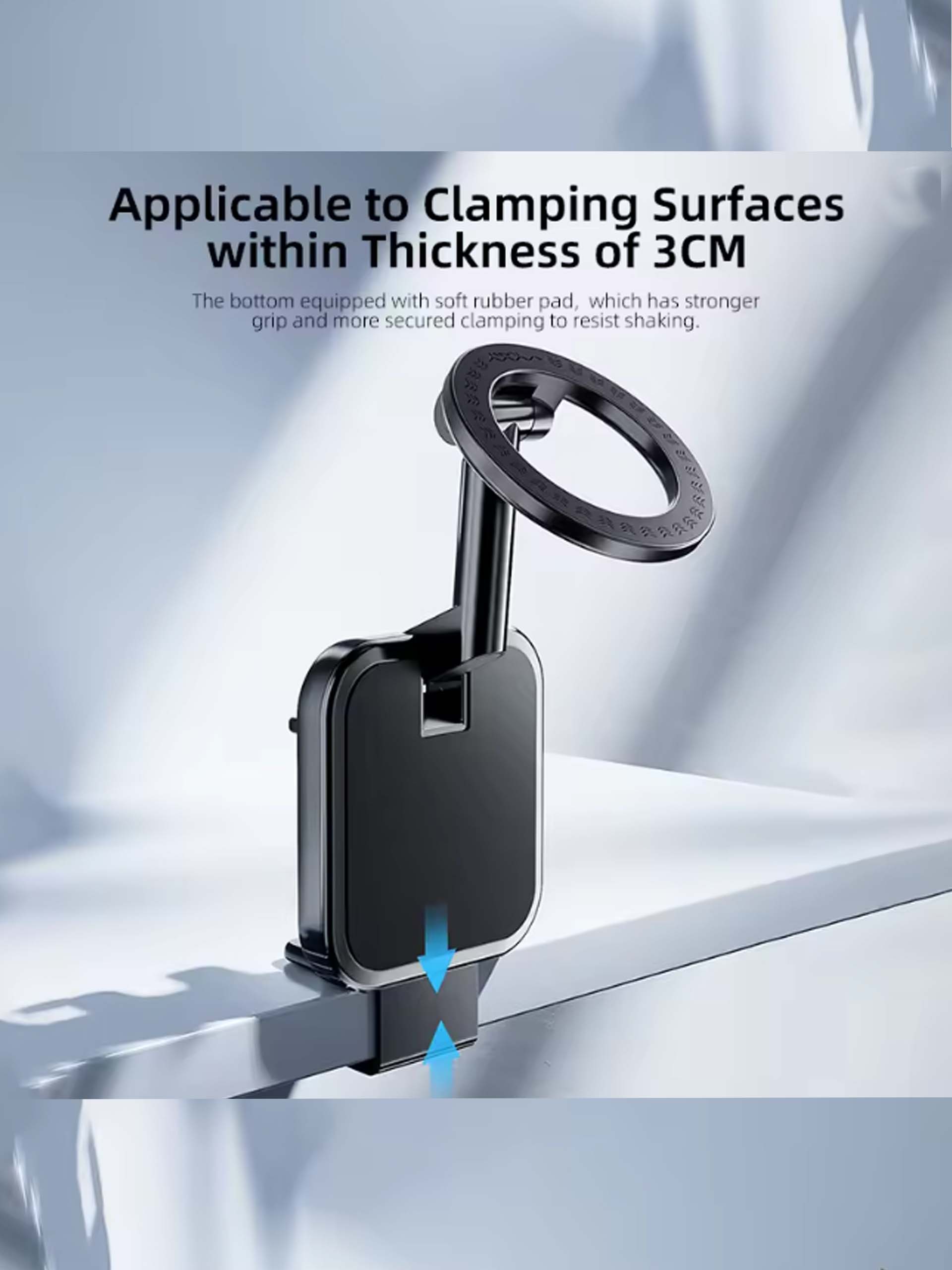 هولدر را میتوان روی سطوحی که ضخامتشان کمتر از ۳ سانتیمتر است نصب کرد. گیره نرم در قسمت زیرین باعث میشود که سطح له یا آسیب نبیند و گوشی لرزش نداشته باشد.